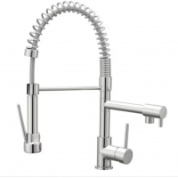 Robinet mitigeur de cuisine à manette unique douchette avec ressorts. Type de cartouche : disque céramique Ø 35 mm. Hauteur : 48 cm. Longueur douchette : 36 cm. Équipé d'un bec orientable pouvant être retiré de sa position de maintien pour allonger sa portée. Inclus 2 becs séparés pour plus de fonctionnalité. Idéal pour les cuisines actives et les chefs passionnés. Fourni : 2 tuyaux tressés flexibles femelles BSP 3/8" avec pré-filtres et fixations intégrés et instructions d'installation.